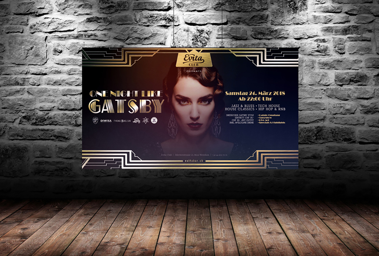 We designed an elegant flyer for a Gatsby Night party, creating a refined visual concept inspired by Art Deco elements and the atmosphere of a glamorous evening celebration.